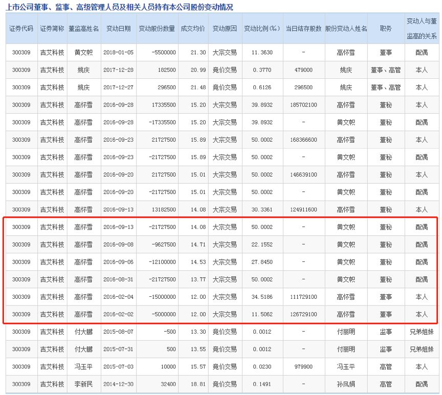 2018年3月23日,實控人高懷雪公告稱通過大宗交易分別減持了550萬股和2450萬股給四川信托-吉艾科技員工持股1號集合資金信托計劃和總經理姚慶,共計減持了6.2%的股份。此次協議轉讓也引來了交易所的問詢。深交所的關注點包括姚慶的資金來源、是否為股權代持等。