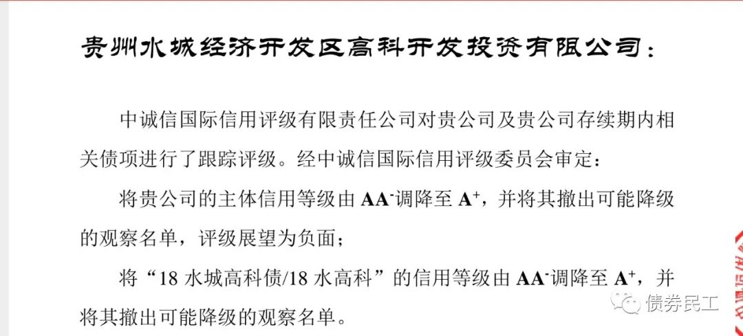 根據中誠信國際2021年6月28日出具的最新跟蹤評級報告,貴州水城經投的主體信用評級由AA-下調至A+。