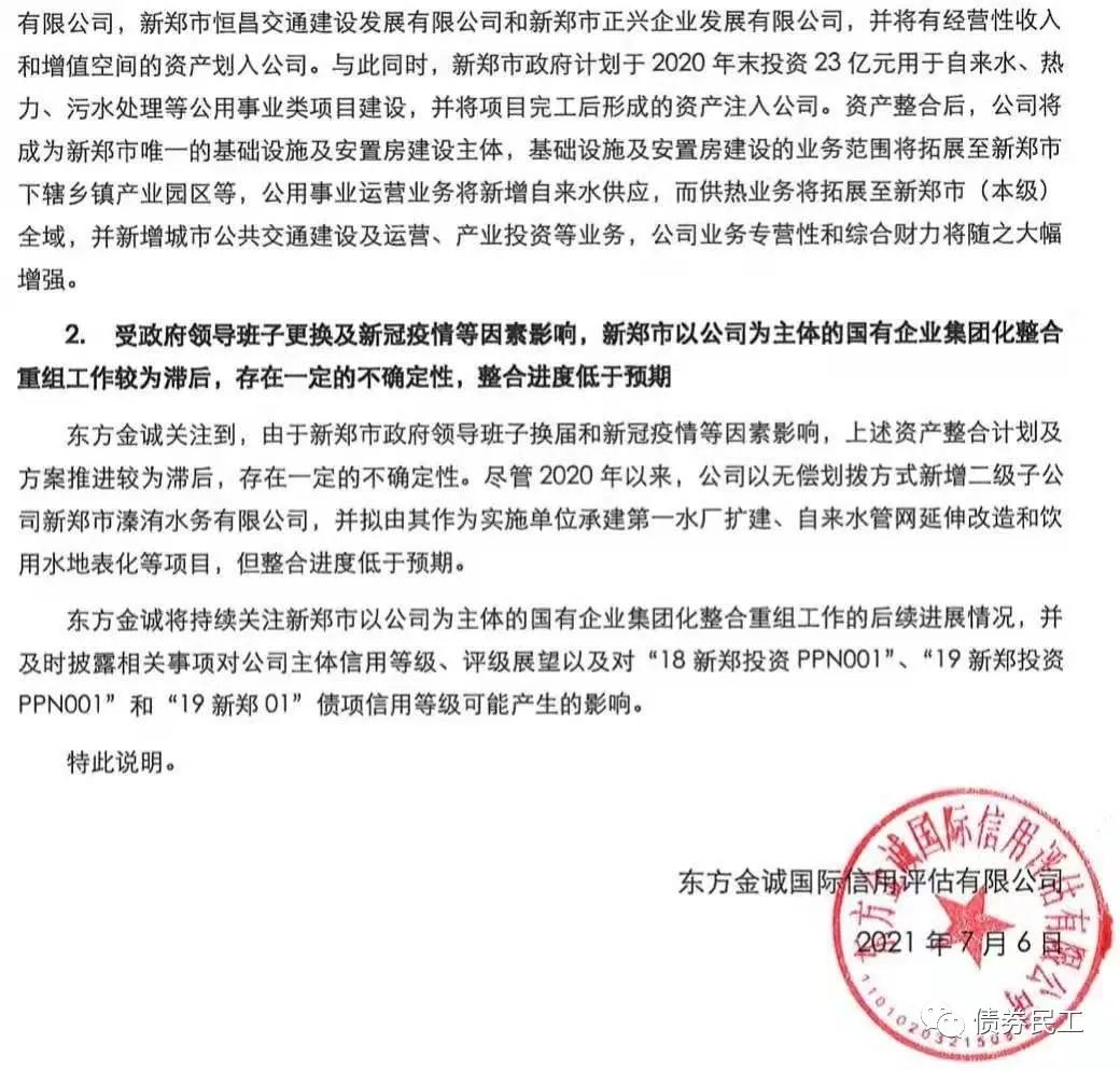 東方金誠于2021年7月6日出具了關于《新鄭新區發展投資有限責任公司關于東方金誠國際信用評估有限公司調整公司評級展望的公告》事項的說明,對新鄭投資的公告進行了回復:一是公司的作業流程已經履行了現場訪談和征求意見等必要程序,二是因為新鄭投資的集團化整合重組工作較為滯后,評級調整理由充分。