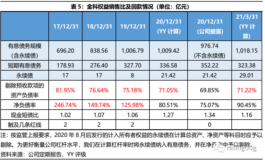 2021年1-6月,金科及所投資的公司實現銷售額約1,021億元,同比增長17.6%;銷售面積約1,005萬平方米,同比增長16.9%。按照2021年銷售目標計劃(不低于2,500億元),上半年完成全年目標的41%。下半年是發力推盤還是動態調整銷售目標仍需觀察。在合作開發成為行業趨勢的背景下,公司權益銷售比下滑到70%左右,仍保持較高水平。在公司推行的一年現金流回正的“高周轉”策略下,2020年回款率達到90%。21年一季度未披露銷售回款,但是對比銷售商品、提供勞務收到的現金和公司的權益銷售額,占比約71.9%,雖然低于2020年水平,但縱向來看波動不大。土地儲備方面,截至21年3月末,公司全口徑剩余可售建筑面積為7,145.48萬平方米,較2020年末基本持平,按2020年簽約銷售面積估算,可支撐未來3年銷售,土儲充足。但正如YY對金科的深度報告所述,公司在2019年擴張中選擇加大城市下沉,導致尚存較大比例土儲位于三線及以下城市。截至21年3月末,公司一二線土儲占比約59%(以二線為主),三線及以下城市土儲占比約41%。低能級城市購買力伴隨棚改紅利褪去,去化面臨一定壓力。邊際來看,2020年至今,公司有意提升拿地城市能級;新增土地儲備按權益計容建筑面積計算,2020年二線(含新一線)城市占比約66%,21年Q1比例提升至84%。區位布局上,公司2021Q1在重慶新增22萬平方米權益計容建面,在4月份的首批集中供地土地拍賣中也有所斬獲,在房企競爭中排名第6。其他主要的投拓項目位于貴陽經開區(離城區較遠)、南寧市的青秀區和綜合保稅區、太原市清徐縣和淮安市清江浦區等。僅從2021Q1新獲土儲來看,公司保持了大本營重慶的優勢,但在其他城市的土儲質量則存在分化,不應僅以城市能級作為評判標準。4.2 表內外債務風險