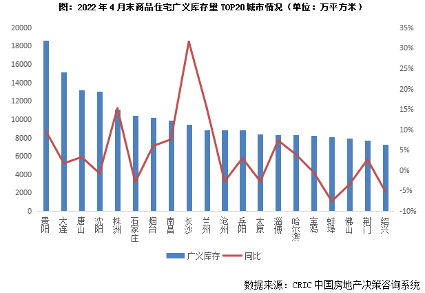 二三線城市中,貴陽、大連、唐山、沈陽、株洲、石家莊、煙臺4月末廣義庫存量遙遙領先,高位持穩,突破1億平方米,南昌、長沙、蘭州、滄州、岳陽、太原、淄博、哈爾濱、寶雞、蚌埠次之,廣義庫存量也達到了8000萬平方米以上。