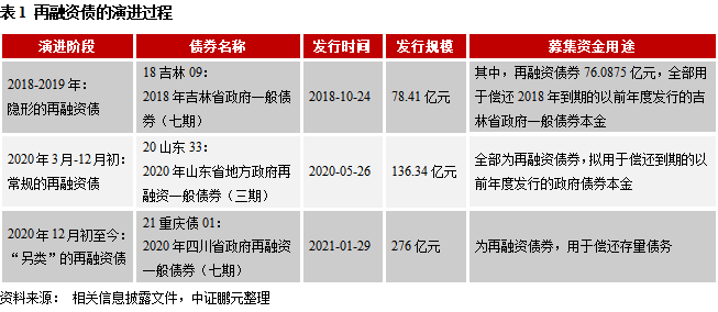 伴隨2015年發(fā)行的首批地方政府債的陸續(xù)到期,自2018年4月起,我國地方政府債在新增債、置換債(含公開發(fā)行和定向置換)的基礎上再添新品種——再融資債(按用途劃分),包括再融資一般債和再融資專項債。不過,彼時查找再融資債還只能通過地方政府債的募集資金用途來進行,債券全稱上并未有體現(xiàn);直到2020年3月,再融資債才直接出現(xiàn)在債券全稱中。從最初的創(chuàng)設初衷和發(fā)行情況來看,再融資債的募集資金應用于償還到期的地方政府債券本金,其中再融資一般債納入一般公共預算管理,用于償還到期的一般債券本金;再融資專項債納入政府性基金預算管理,用于償還到期的專項債本金。我們認為,再融資債之所以成為地方政府債的新品種,是大規(guī)模的、早年發(fā)行的地方政府債到期后需要“借新還舊”所導致的結果,符合市場預期,并不意味著地方政府舉債、化債等相關政策出現(xiàn)重大調整。但值得注意的是,從2020年12月起再融資債的募集資金用途悄然發(fā)生了變化,從明確指出“用于償還到期的地方政府債券本金”變成了模糊的“用于償還存量債務”。至此,再融資債完成了又一次的“迭代”,市場將這一批再融資債命名為“另類”再融資債。下表中,我們選取了三只不同階段發(fā)行的地方政府債為樣本,呈現(xiàn)了再融資債的演進過程,便于大家理解。