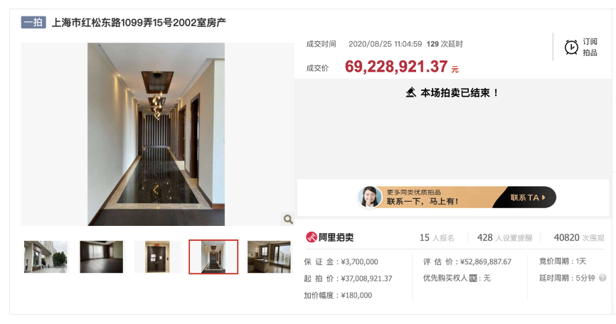 去年8月,司法平臺上一套標的為“上海市紅松東路1099弄15號2002室”的房產被競拍者以69228921.37元(約7千萬)的價格拍下,比評估價5287萬高出了1636萬。