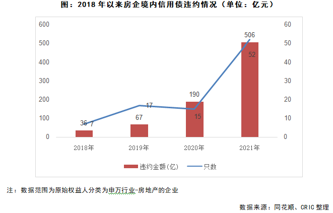 在當前機構的白名單主要針對國資企業以及部分優秀的民營企業的情況下,房企債券違約還在不斷發生,且由境外債券的違約帶來的連鎖反應也可能引發境內債券危機。根據同花順數據顯示,近幾年來房企境內債違約規模連年翻番,2021年房企境內信用債違約數量就達到52只,約是2020年的3.5倍,重點房企債券違約涉及金額約506億元。