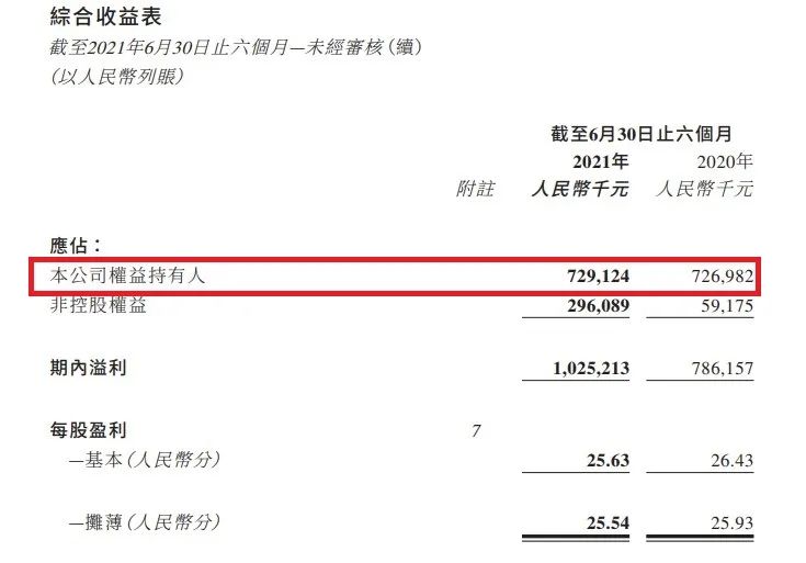2020上半年,如下圖,歸母凈利潤為7.27億億元,2021年同期,7.29億元。