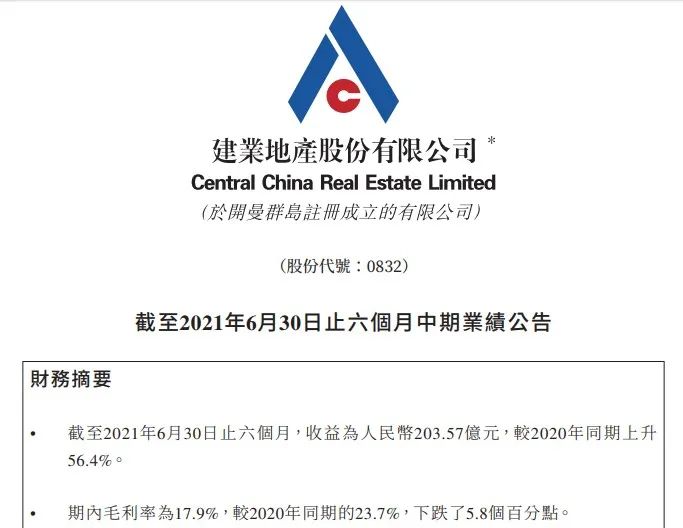 對了,建業地產的中期業績公告說: