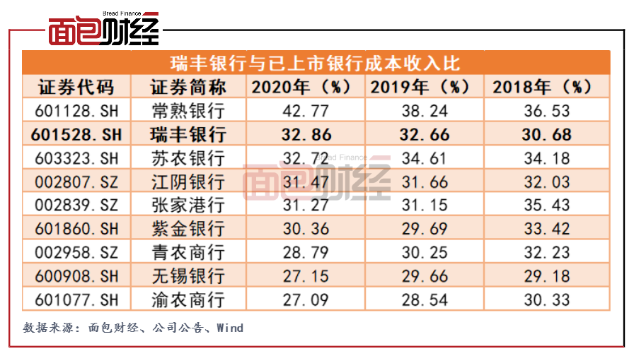 但值得注意的是,瑞豐銀行的成本收入比一直處于較高水平。截至2020年末,該行的成本收入比為32.86%,較上年末相比上升0.2個百分點。與已上市農商行相比,僅次于常熟銀行,排在第二位。