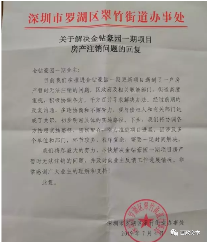 金鉆豪園項目解決方式:將項目拖延半年后,經過羅湖區、翠竹街道辦介入協調,債權人申請解封,在項目建成后再次申請查封。
