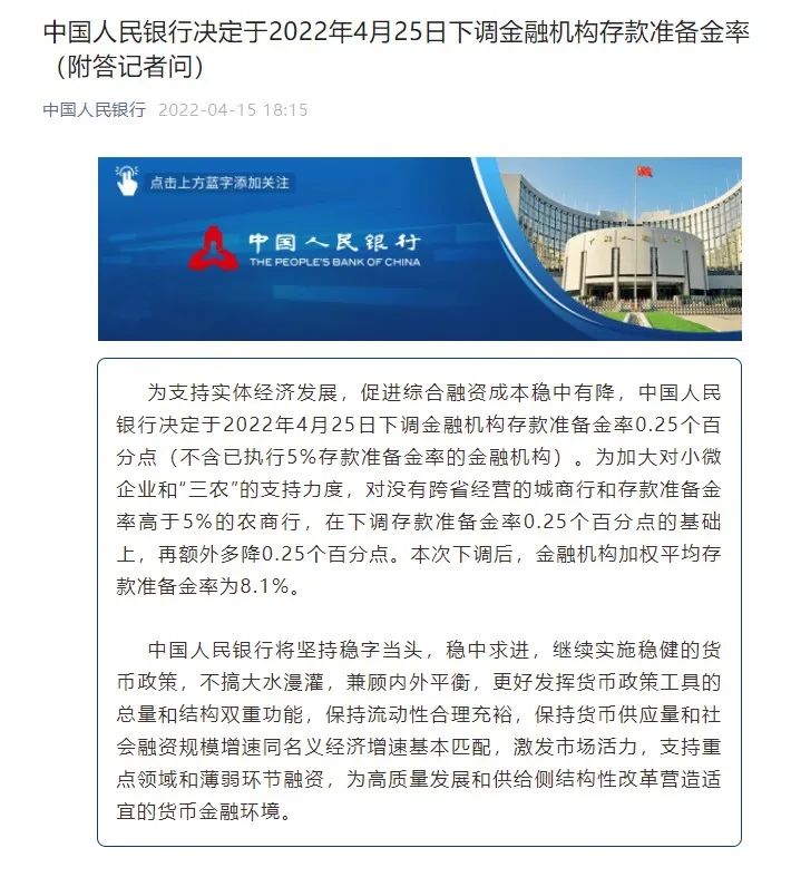 決定于2022年4月25日下調(diào)金融機構(gòu)存款準(zhǔn)備金率0.25個百分點(不含已執(zhí)行5%存款準(zhǔn)備金率的金融機構(gòu))。