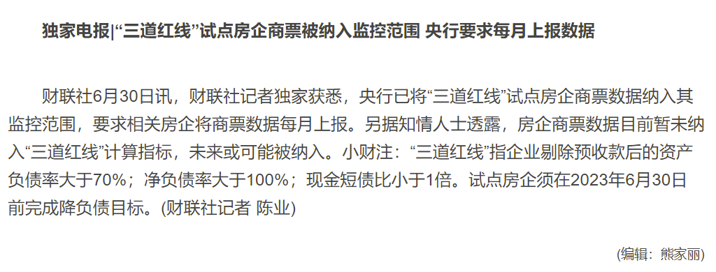 目前的口徑是,“三道紅線”試點房企需要逐月上報商票數據,納入監(jiān)控范圍。