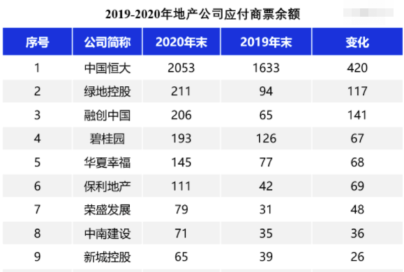 安信證券研報顯示,2020年下半年,房地產融資政策明顯收緊,多數房企商票余額明顯增長,保利、新城、綠地等房企商票規(guī)模漲幅均在一倍以上。