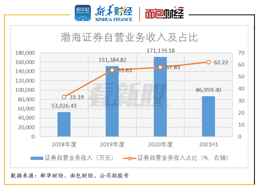 2018年至2021年上半年,渤海證券的收入持續依賴證券自營業務。2021年上半年,該業務貢獻收入8.7億元,占總營收62.22%。