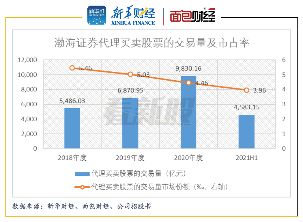 信披資料顯示,2018年至2021年上半年,在傳統的證券經紀業務中,公司代理買賣股票交易量的市占率有所下滑。自2019年以后,渤海證券的投行業務收入規模也有所萎縮。渤海證券在上市募資補血的同時,面臨固本培元、轉變發展模式的多重挑戰。