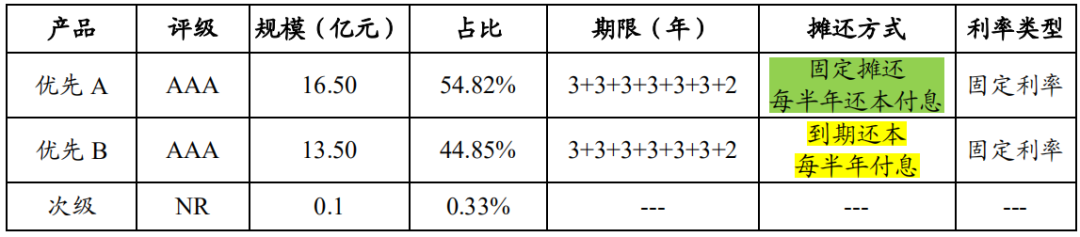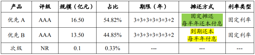 以“北京首都開發(fā)股份有限公司 2020 年度第一期資產(chǎn)支持票據(jù)”為例,根據(jù)募集說明書披露,優(yōu)先級證券按照攤還方式不同分為優(yōu)先A和優(yōu)先B,優(yōu)先A每半年還本付息,優(yōu)先B每半年付息,到期還本。