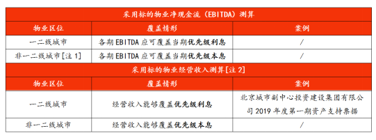 注1:一、二線和非一、二線物業(yè)均入池,且以一、二線物業(yè)為主的,按照一二線城市要求測算優(yōu)先級利息覆蓋倍數(shù)