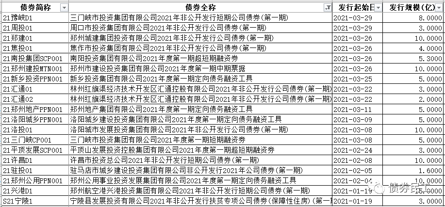 永煤事件之后,河南省信用債券市場受到了嚴重的影響,區域債券發行數量和金額大幅下降。但是,從債券發行的情況來看,河南區域的信用修復已經開始了,尤其是城投公司。2021年一季度,河南省城投公司發行債券19只,累計發行債券金額為117.90億元。