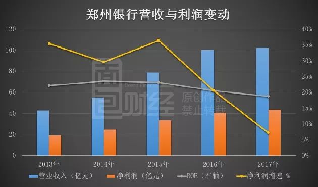 翻查財報,鄭州銀行營業收入由2013年的42.57億元,上升至2017年的102.13億元,增幅139.91%。同期,凈利潤由19.02億元增至43.34億元,增長127.86%。