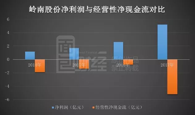 公開數(shù)據(jù)顯示:2014-2017年,嶺南股份凈利潤合計約10.65億元,經(jīng)營性現(xiàn)金凈流出約9.25億。2017年,公司經(jīng)營性凈現(xiàn)金流與凈利潤的背離程度明顯擴大,凈利潤約5.18億元,經(jīng)營性現(xiàn)金凈流出約5.21億元,兩者相差數(shù)額超過10億。