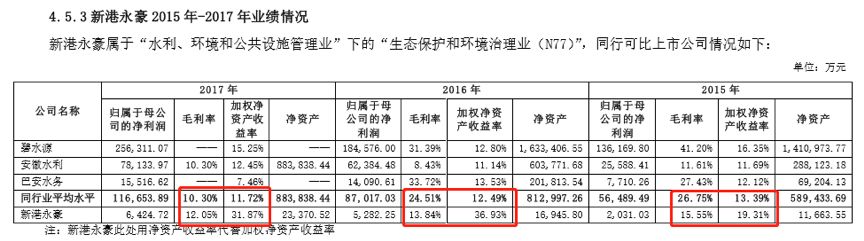 再看看這家公司與同行業(yè)相同財務(wù)指標(biāo)的對比情況:2015-2017年,新港永豪ROE分別為19.31%、36.93%及31.87%,同行業(yè)平均ROE分別為13.39%、12.49%及11.72%。以下為公開信息中披露的行業(yè)對比情況: