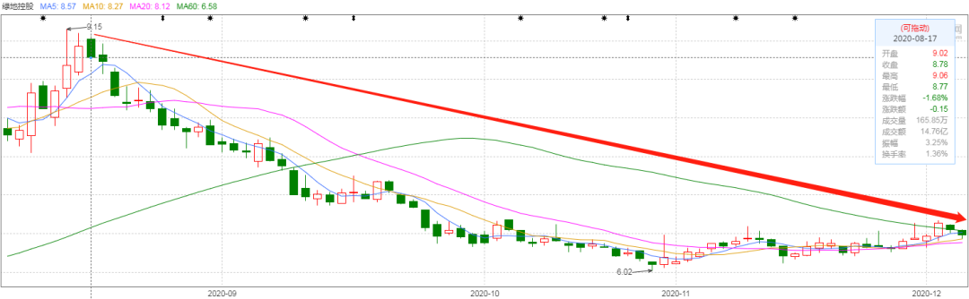 債市表現不佳,股市亦如此。今年8月以來,綠地控股股價從最高點的9.15跌至最低點6.02,市值縮水明顯。