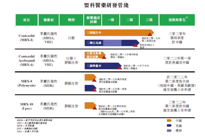 盟科醫藥是以研發多重耐藥即超級細菌感染的抗菌藥為主。公司的在研項目只有4個,其中主要產品有治療革蘭氏陽性多重耐藥菌感染的contezolid(MRX-I)以及contezolid acefosail(MRX-4)。公司研發最快的項目MRX-I預計最快2020年年底在國內上市。