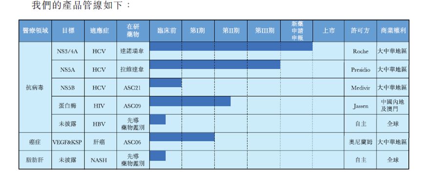 公司的核心產品包括戈諾衛(達諾瑞韋)、拉維達韋、ASC09以及ASC06。目前中國食品藥品監管總局于2018年6月8日授出有關戈諾衛的新藥申請批準,并在國內開始將戈諾衛進行商業化。以下是公司7個在研藥品的研發進度。