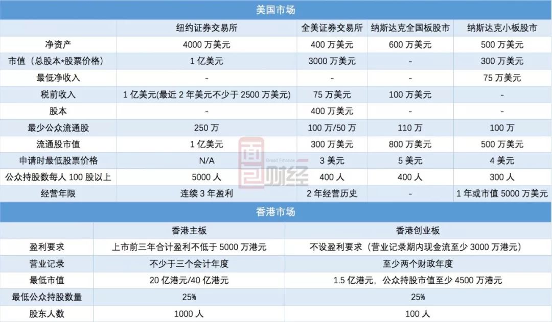 我們先來簡單看一下兩個市場的發行要求: