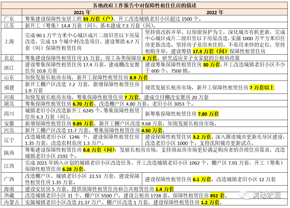 (三)多地在政府工作報(bào)告中提出了2022年保障性租賃住房建設(shè)的具體任務(wù),如廣東33萬套、浙江30萬套、上海17.30萬套、江蘇14.80萬套、安徽9.85萬套、山東8.90萬套、陜西8.80萬套、北京8萬套、四川7.80萬套、福建與河南均為7萬套、湖北6.70萬套、廣西6.10萬套等。