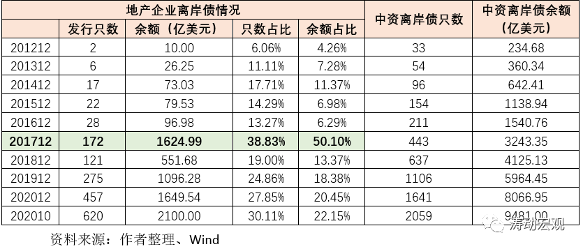 2、自2012年11月15日國(guó)資背景的中國(guó)海外發(fā)展在香港發(fā)行第一只離岸地產(chǎn)債以來,不到十年的時(shí)間里,中資離岸地產(chǎn)債數(shù)量已驟升至目前的620只,規(guī)模亦達(dá)到2100億美元(約合人民幣1.40萬億元),占全部中資離岸債規(guī)模的22%以上,成為僅次于金融債的第二大中資離岸債品種。