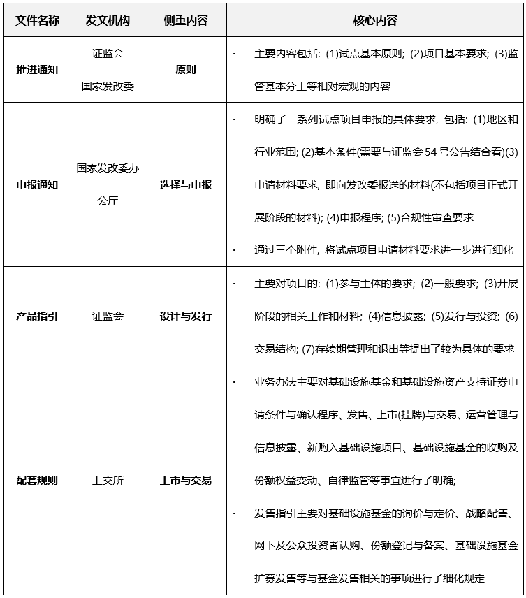 結(jié)合此前已經(jīng)頒布的包括《關(guān)于推進(jìn)基礎(chǔ)設(shè)施領(lǐng)域不動(dòng)產(chǎn)投資信托基金(REITs)試點(diǎn)相關(guān)工作的通知》(“40號(hào)通知”或“推進(jìn)通知”)、《關(guān)于做好基礎(chǔ)設(shè)施領(lǐng)域不動(dòng)產(chǎn)投資信托基金(REITs)試點(diǎn)項(xiàng)目申報(bào)工作的通知》(“586號(hào)文”或“申報(bào)通知”)、《公開(kāi)募集基礎(chǔ)設(shè)施證券投資基金指引(試行)》(“54號(hào)公告”或“產(chǎn)品指引”), 我們認(rèn)為, 配套規(guī)則和上述規(guī)范性文件, 具有清晰的層次和明確的分工, 分別從原則、選擇與申報(bào)、設(shè)計(jì)與發(fā)行、上市與交易的角度, 共同完善并構(gòu)成了公募REITs業(yè)務(wù)的規(guī)則體系。