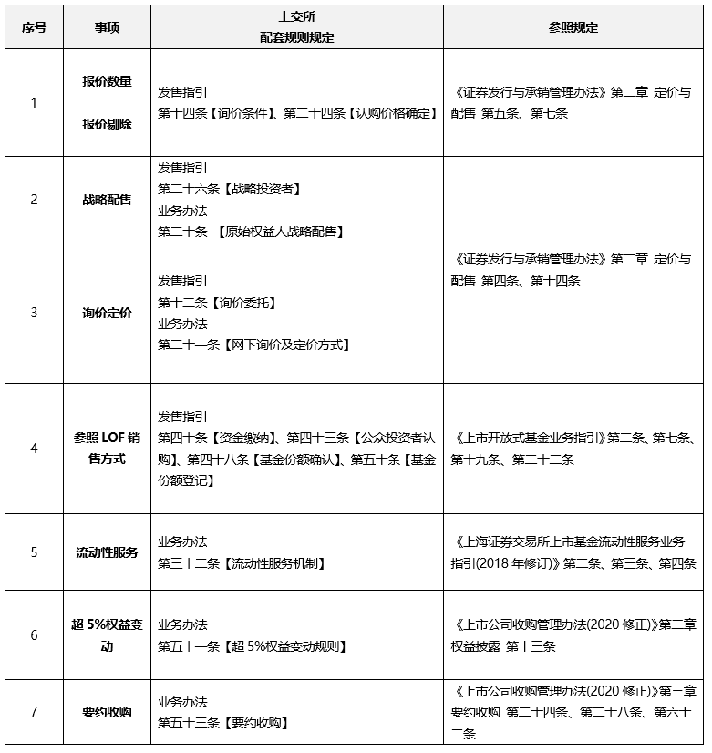 從思路來(lái)看, 配套規(guī)則總體采取了“比照股性規(guī)則, 搭建獨(dú)立體系”的總體立法思路。在業(yè)務(wù)辦法中, 比照了公開(kāi)發(fā)行證券要求建立掛牌和上市審查制度, 但在全流程重要節(jié)點(diǎn)和關(guān)鍵環(huán)節(jié)規(guī)范與權(quán)責(zé)分配的角度, 保留了REITs產(chǎn)品的特殊性特色。在發(fā)售指引中, 借鑒了股票定價(jià)和LOF基金發(fā)售, 對(duì)公募REITs的詢價(jià)和定價(jià)進(jìn)行了規(guī)范, 但同時(shí)在投資者報(bào)價(jià)個(gè)數(shù)要求、報(bào)價(jià)剔除、戰(zhàn)略配售機(jī)制等方面充分結(jié)合產(chǎn)品屬性特征, 作出了區(qū)別股票的特有安排。