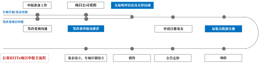 其一, 公募RETIs作為公募基金和資產(chǎn)支持證券相結(jié)合的產(chǎn)品, 上交所借鑒了此前對(duì)資產(chǎn)支持證券的管理經(jīng)驗(yàn), 結(jié)合公開(kāi)證券發(fā)行的要求, 細(xì)化了對(duì)基礎(chǔ)設(shè)施資產(chǎn)支持證券的掛牌及基金上市的申請(qǐng)條件、協(xié)同盡調(diào)、申請(qǐng)文件等方面的要求, 同時(shí)明確了材料受理、審核與反饋所需時(shí)間。我們對(duì)公募REITs的申報(bào)全流程及上交所基本審核程序的梳理如下圖所示: