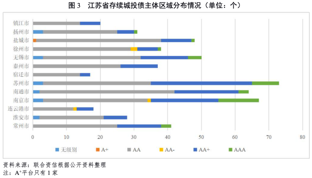 江蘇省作為國內城投債存量規模最大的省份,發債城投企業數量眾多,以區縣及園區級AA企業為主,發債城投企業在信用水平上整體呈現“南高北低”的格局。