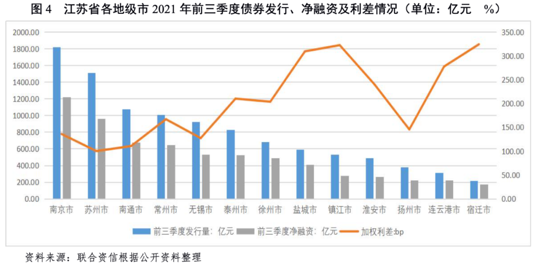 從債券發行來看,2021年前三季度江蘇省合計發行城投債規模10355.57億元,居全國首位。省內看,南京、蘇州發行規模均超過1500億元,南京市發行規模最大,超過1800億元,其次為南通、常州市,超過1000億元;宿遷、連云港、淮安及揚州發行規模較小,均低于500億元,宿遷新發規模最??;其他地級市發行規模位于500~1000億元之間,省內債券新發整體集中于蘇南地區。