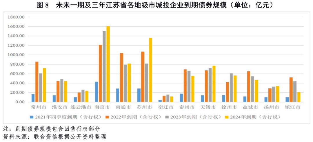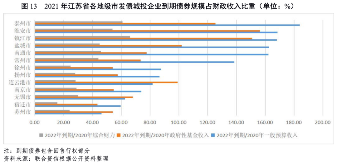我們以城投企業2022年到期債券規模占一般公共預算收入或政府性基金收入的比重來衡量一般公共預算收入或政府性基金收入對到期債券的覆蓋情況,償債能力偏弱的城市為泰州市、淮安市和鎮江市;以城投企業2022年到期債券占2020年地方政府綜合財力的比重來近似衡量2022年城投債券的到期償還能力,泰州市、鎮江市和淮安市城投企業2022年到期債券占地方政府綜合財力的占比分別為60.86%、66.17%和53.92%??傮w看,泰州市、鎮江市和淮安市城投企業2022年到期債券的償還能力偏弱。