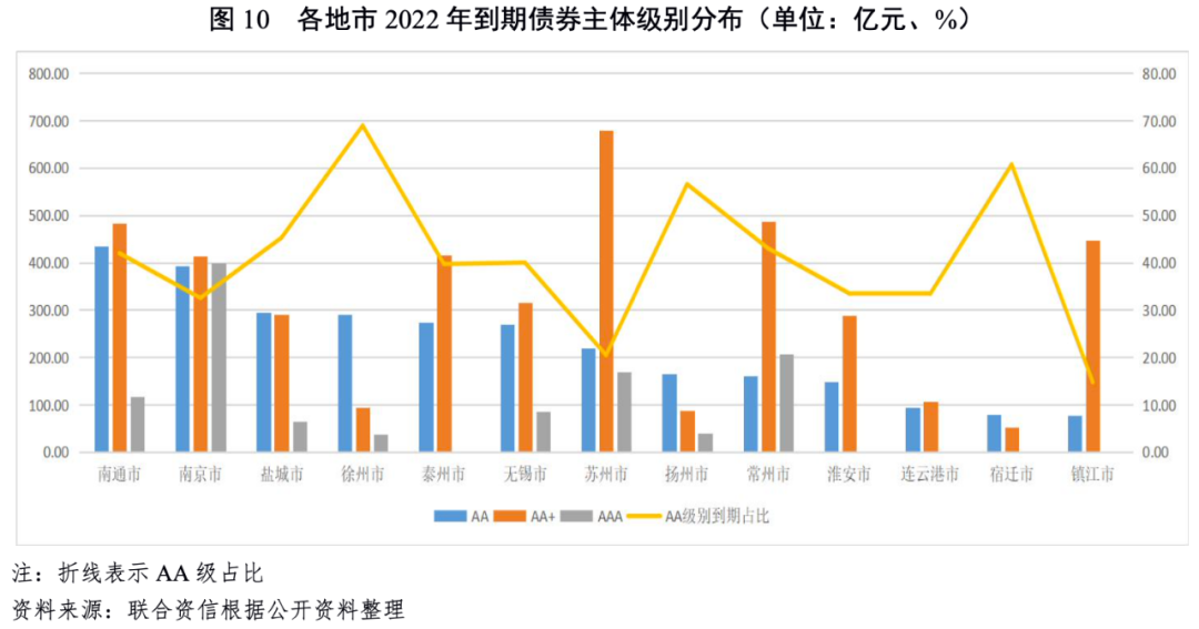 江蘇省未來三年內債券到期分布較均勻,2022年到期債券城投企業以區縣及園區級為主,主體級別以高等級為主;其中南京市、南通市及蘇州市債券到期規模較大,鎮江、宿遷、連云港及淮安市到期城投債券行政層級以市級為主,宿遷市、徐州市和揚州市低級別城投企業存續債到期規模占其債券總額比重較高。