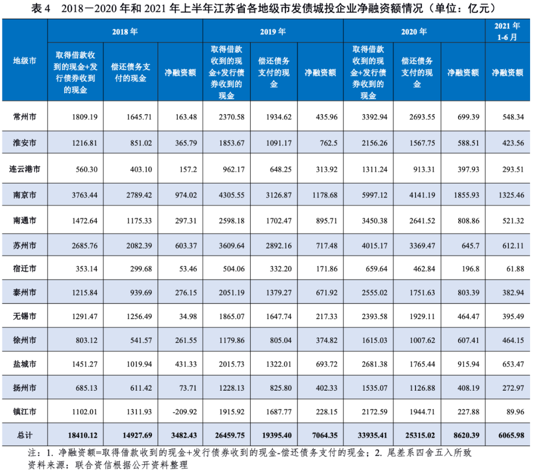 2020年,江蘇省發債城投企業債務負擔有所加重,常州市、南京市、泰州市城投企業債務負擔較重;短期償債能力指標有所弱化,鎮江市城投企業短期償債能力相對較弱,常州市和泰州市區縣級城投企業短期償債壓力較大。江蘇省城投企業整體融資環境良好,城投企業凈融資持續增長,2020年增速同比下滑,淮安市城投企業凈融資同比降幅較大;2021年上半年,江蘇省城投企業債券凈融資情況整體較好,宿遷市和鎮江市凈融資額偏低,進度偏慢。