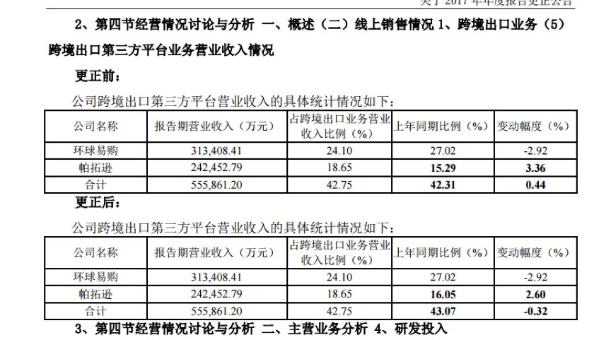 但是,跨境通的年報數據質量并不太讓人放心。公司在2018年4月28日發布了2017年年度報告,但隨后又對年報的部分內容進行了修正,并在2018年5月5日發布了更新后的2017年年度報告。