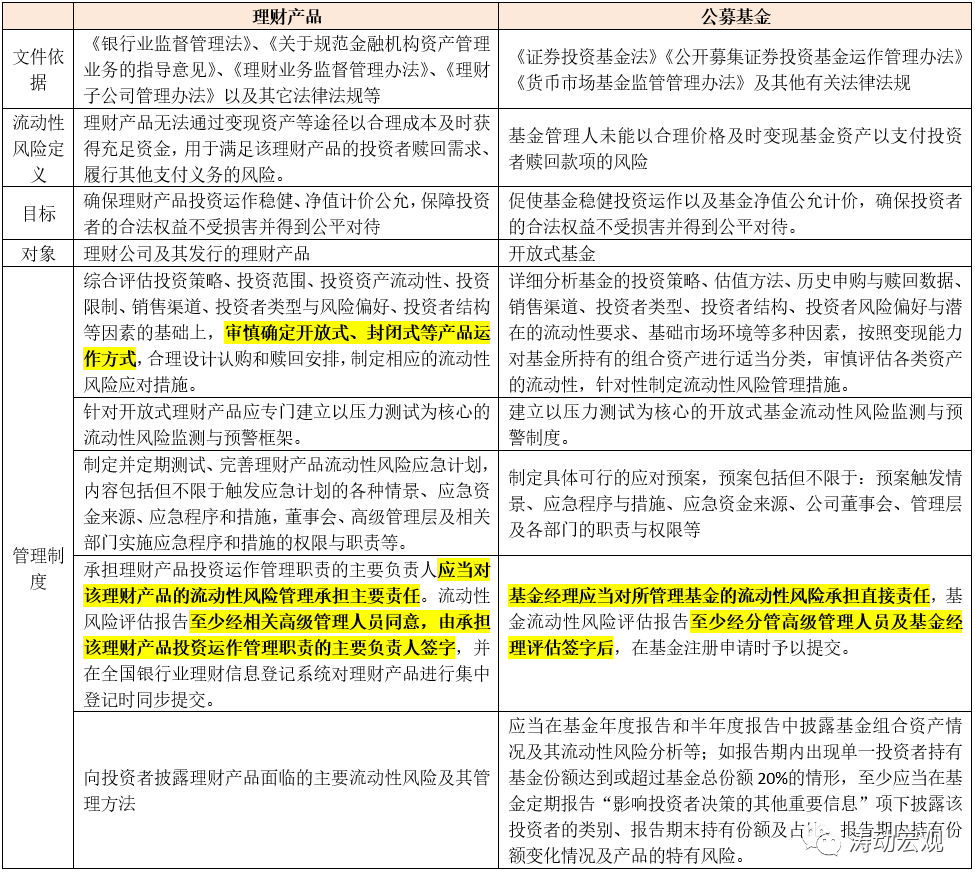 (四)從管理制度上看,均需要制定相應的流動性風險應對措施、應急計劃(或預案)。同時在責任主體上二者也有一定相似性,即投資負責人是第一責任人、相關高管需要在流動性風險評估報告簽字。具體看,