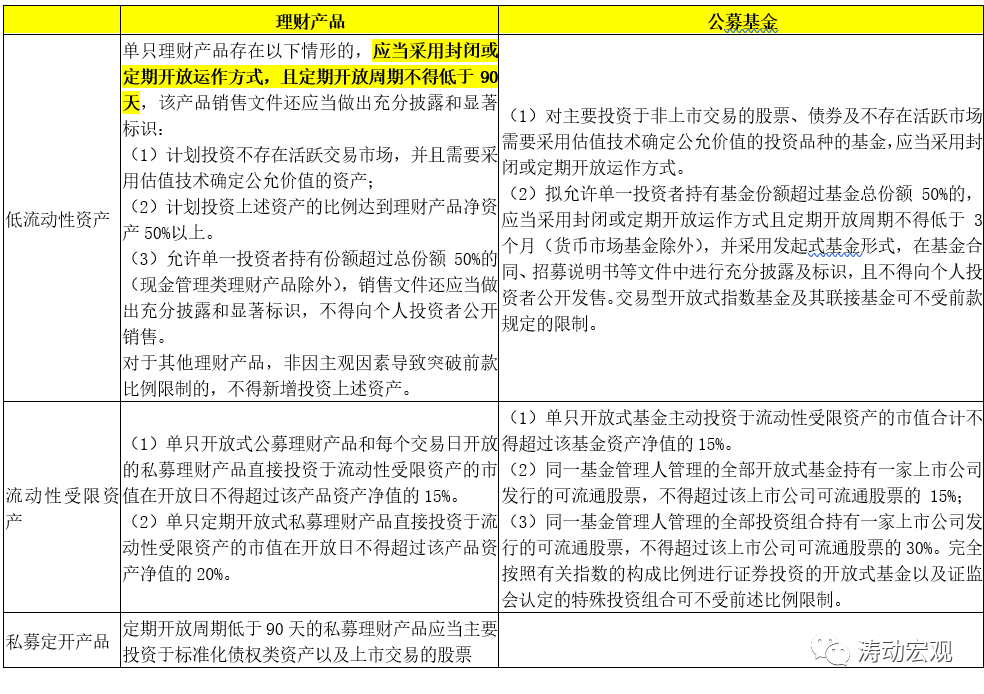 1、單只產品在投資低流動性資產時,理財產品與公募基金均明確應當采用封閉或定期開放運作方式,同時理財產品還明確定期開放周期不得低于90天。