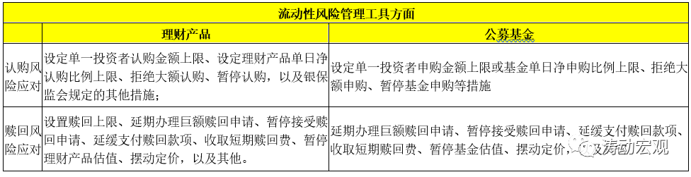 從流動性風險管理工具方面來看,理財產品與公募基金基本是相同的。