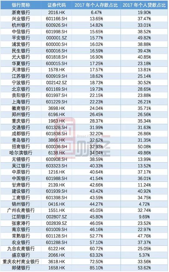 在梳理浙商銀行的存款構成時,我們發現了一個令人驚訝的數據。先看A股和港股41家上市銀行2017年個人存款占存款總額的排名情況: