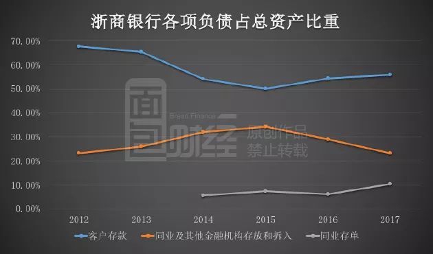 目前,同業存單和同業存款這兩項同業負債合計占浙商銀行總資產的比重為33.6%,而這一比重在2015年更是高達41.71%。