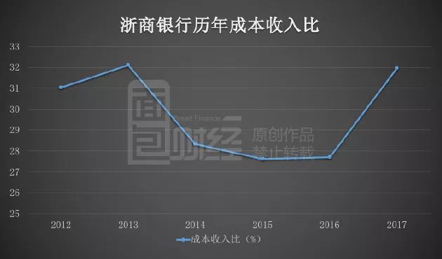成本收入比是反應銀行成本控制的一個重要指標,在經過前幾年的持續改善后,浙商銀行2017年成本收入比的攀升十分明顯: