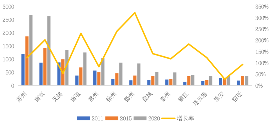 圖:江蘇省各市2011年、2015年2020年房地產開發投資額及近10年增長率