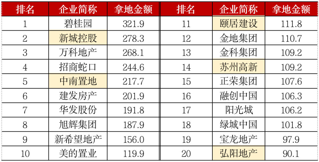 表:2020年江蘇省房企招拍掛拿地金額TOP20(單位:億元)