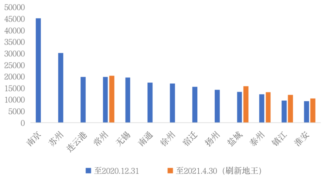 據CRIC統計,早在2016、2018年,南京和蘇州的地王樓板價就分別突破4.5萬/平方米和3萬/平方米,高于省內其他城市,近兩年熱度不減,仍有德信、大家等中小房企涌入。同時,至2020年4月30日,連云港、常州、無錫三個城市的地王樓板價也即將突破2萬元大關,特別是無錫,在不久前結束的首次集中供地中,成交16宗地塊有12宗都被50強房企拿下,平均可比地價上漲30%以上。一方面由于棚改需求釋放,另一方面由于外來開發商加速進駐,其他城市的地價也出現了不同程度的上升,部分在2021年前四月刷新了原先的地王樓板價。