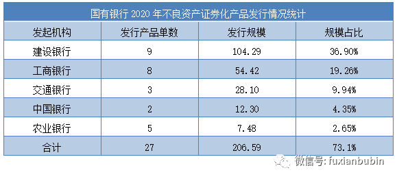 伴隨著不良資產(chǎn)證券化產(chǎn)品試點(diǎn)的擴(kuò)容,參與機(jī)構(gòu)的類型逐漸從國有銀行、股份制銀行向城商行拓展,從銀行類金融機(jī)構(gòu)向非銀行類金融機(jī)構(gòu)延展,發(fā)行主體日漸多元,截止到2020年年末,不良資產(chǎn)證券化產(chǎn)品發(fā)行主體主要包括國有銀行、股份制銀行、城商行和金融資產(chǎn)管理公司這兩大類四種類型十五家機(jī)構(gòu),共發(fā)行55單,發(fā)行規(guī)模達(dá)282.60億元,國有銀行依然獨(dú)占鰲頭,發(fā)行規(guī)模和單數(shù)最多,發(fā)行規(guī)模占整個不良資產(chǎn)證券化發(fā)行規(guī)模的73.1%。整體處于第一梯隊: