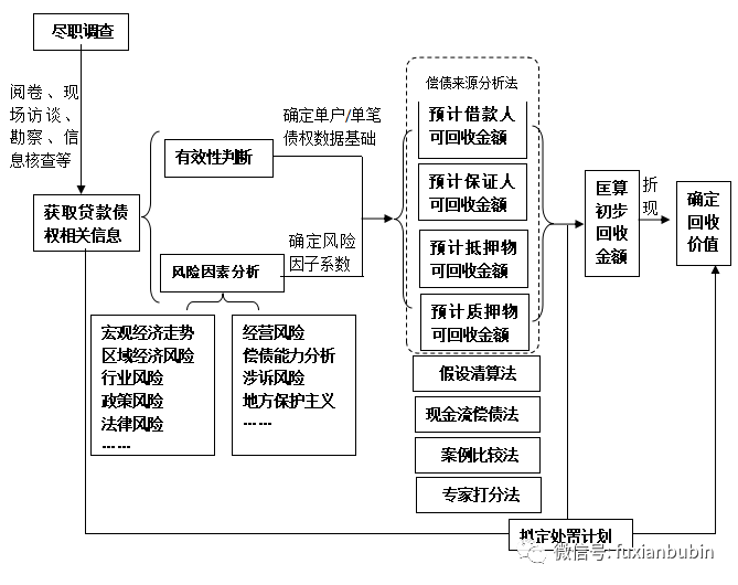 在基礎(chǔ)資產(chǎn)信用質(zhì)量分析上,要結(jié)合不良資產(chǎn)的特點(diǎn),以資產(chǎn)回收率和資產(chǎn)相關(guān)性作為審查的重點(diǎn),結(jié)合貸款人所在地區(qū)、貸款人所屬行業(yè)、擔(dān)保類型、抵押物類型、債務(wù)人經(jīng)營情況、企業(yè)性質(zhì)、債務(wù)人集中度對資產(chǎn)池指標(biāo)進(jìn)行分析,然后再對平均資產(chǎn)相關(guān)性、平均回收率、回收時間分布、現(xiàn)金流和壓力測試等資產(chǎn)池信用質(zhì)量指標(biāo)進(jìn)行分析。其中,針對區(qū)域宏觀經(jīng)濟(jì)、區(qū)域司法環(huán)境、借款人情況、擔(dān)保人情況、抵押物情況和擬處置方案等內(nèi)容,以重要性和代表性為原則進(jìn)行抽樣分析,形成抽樣盡調(diào)樣本;針對發(fā)起人的靜態(tài)池、動態(tài)池的歷史回收數(shù)據(jù),進(jìn)行數(shù)據(jù)模擬判別回歸分析,統(tǒng)籌上述信息,對基準(zhǔn)情景資產(chǎn)池回收金和回收時間進(jìn)行測算,對于不良資產(chǎn)證券化的評級基本流程如下圖所示: