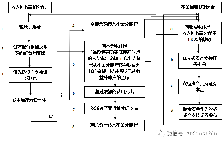 流動性問題是指現(xiàn)金流短期流動性不足。發(fā)生的原因在于當(dāng)期資產(chǎn)池現(xiàn)金流因資產(chǎn)池中產(chǎn)生的任何損失以外的事由而引發(fā)短缺,因而無法足額向資產(chǎn)支持證券的投資者兌付當(dāng)期本金和利息的問題。目前的不良資產(chǎn)證券化項目中,一般僅為當(dāng)期應(yīng)付的稅費(fèi)、高級費(fèi)用以及優(yōu)先級資產(chǎn)支持證券利息提供流動性支持。具體分配如下圖: